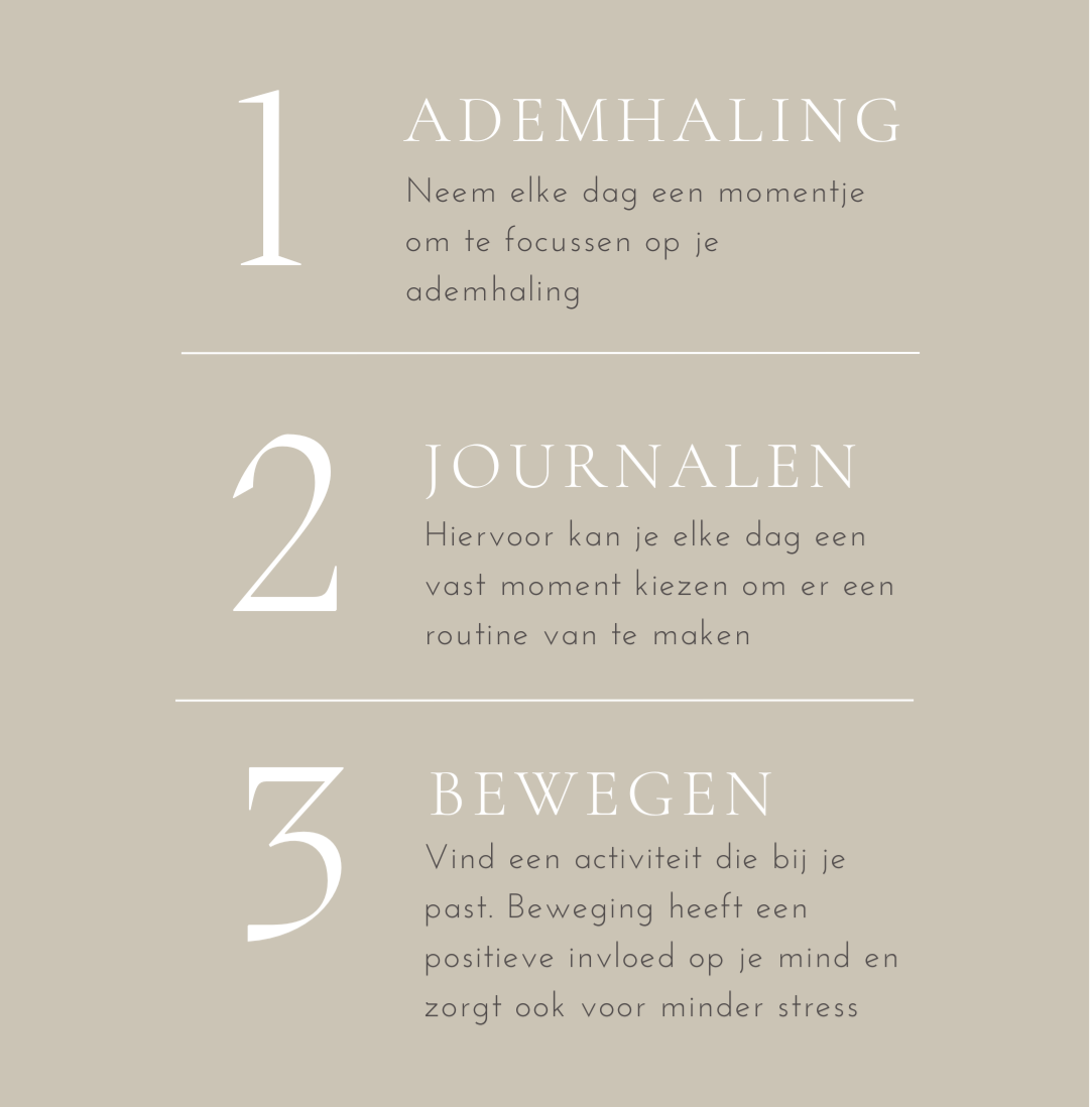 - Bewegen: Heeft een ontzettend goede invloed op de mentale gezondheid. Ook hier zijn talloze opties voor en wederom is het belangrijk dat je iets kiest wat goed bij je past. Tijdens werk zou je bijvoorbeeld even je lichaam kunnen rekken of een rondje gaan lopen. Als je meer tijd hebt kan je bijvoorbeeld een sport gaan doen.